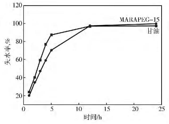 由圖3可以看出:MARAPEG-15的質量隨時間增加不是十分明顯,說明Gemini非離子表面活性劑MARAPEG-15吸水性能不理想,而甘油質量隨時間增加較明顯,表明吸濕性能不及甘油。由圖4可以看出:在前10h,MARAPEG-15的保濕性能比甘油略差,而24h后,MARAPEG-15的保濕性能與甘油基本相同。