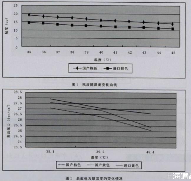 3)進(jìn)口陶瓷墨水與國產(chǎn)陶瓷墨水相比,內(nèi)在的性能參數(shù)(表面張力、粘度、容重)隨溫度變化的規(guī)律一致。