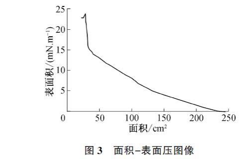 用LB膜分析儀研究了膠原蛋白肽LB膜的表面壓-面積曲線,如圖3所示。當(dāng)膠原蛋白肽氯仿溶液被滴加在亞相表面上,隨著氯仿在亞相表面的鋪散,膠原蛋白肽呈分散狀態(tài),分子間距較遠(yuǎn),單分子所占面積大,呈現(xiàn)出LB膜制備過(guò)程中氣相狀態(tài)特點(diǎn),表面壓幾乎為零。在氯仿溶劑揮發(fā)干凈后,隨著滑障的壓縮膠原蛋白肽分子互相靠近,單分子所占面積變小,當(dāng)分子間距離縮短至液相狀態(tài),可以檢測(cè)到表面壓開(kāi)始緩緩上升。繼續(xù)壓縮,亞相表面上的膠原蛋白分子由液態(tài)向固態(tài)轉(zhuǎn)變,分子間距快速減小,表面壓快速上升,此時(shí)形成固相狀態(tài)的單分子膜,分子之間排列緊密。繼續(xù)壓縮,可以使分子間距到達(dá)最小值,表面壓升至最高,即為其崩潰壓力,再壓縮則形成的單分子層會(huì)瞬間崩潰。經(jīng)圖3結(jié)果中可以看出,膠原蛋白肽的成膜過(guò)程符合標(biāo)準(zhǔn)朗格繆爾膜成膜過(guò)程的相關(guān)特性,其崩潰壓力為23.8 mN/m,維持表面壓為23 mN/m,可以得到穩(wěn)定的膠原蛋白肽單分子層,實(shí)現(xiàn)LB膜的固相轉(zhuǎn)移,制備膠原蛋白肽覆層羥基磷灰石材料。