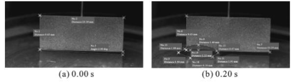 以鉑金板浸入至1%和25%氨水溶液的瞬時浸潤過程為例(見圖1、圖2),鉑金板底部與水平液面存在一定角度,經HAS-Xviewer Ver軟件校準測量,鉑金板浸入1%和25%氨水溶液過程中鉑金板底部與其倒影夾角分別為2.08,1.37°。