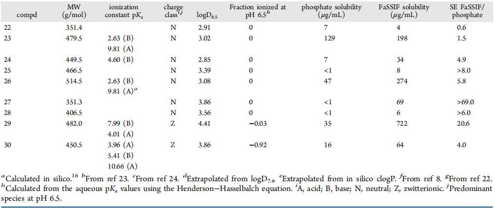 在FaSSIF和水性緩沖液中的溶解度評估和物理化學特性。選擇了一組21種上市藥物和30種來自不同研究項目的羅氏化合物,因為它們在pH值為6.5的水性緩沖液和FaSSIF介質中的溶解度不同。作為標準做法,所有溶解度和表面壓力剖面測量均在室溫下進行,而不是在37°C下進行。盡管溫度可能會影響藥物溶解度、脂質聚集體分配和溶解,據報道,牛磺膽酸膠束的聚集數對溫度變化相對不敏感。19該化合物組包含不同的化學性質、廣泛的親脂性,并涵蓋不同類型和程度的電荷狀態,包括中性、酸性、堿性和兩性離子分子。表1列出了主要理化性質和溶解度數據。