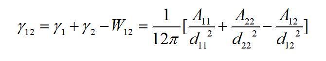 為物質1的Hamaker常數。該作用勢能就相當于本體的內聚功。從表面自由能的定義不難看出,當將本體沿本體內的一個界面分開時,單位面積需要克服內聚力所做的功就等于這個作用勢能。由于分開后形成兩個新表面,因此每個表面上的勢能等于該勢能的一半。因此物體的表面自由能(表面張力)也等于該作用勢能的一半,即