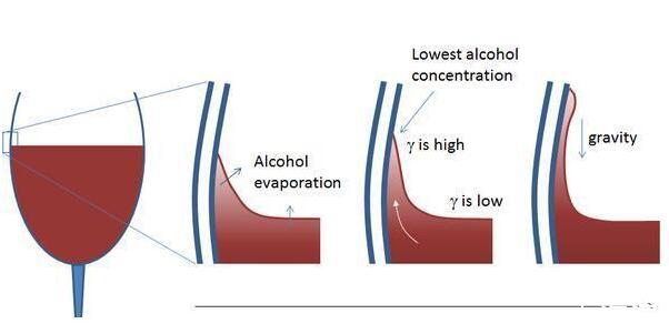 瑪拉高尼效應(yīng)不光存在于物理實(shí)驗(yàn)和我們之前開的玩笑之中,在我們的日常生活中也有馬拉高尼效應(yīng)的體現(xiàn),這一現(xiàn)象可能每一個人都見過,那么就是我們在喝酒的過程中看到的所謂的好酒會掛壁的現(xiàn)象。就算再好的酒,它也是有水在其中的。好酒中的酒精由于毛細(xì)效應(yīng)爬到高處的時候,酒精蒸發(fā),使得處于上層的酒液的酒精含量相比較于下層來說要低,而同時的酒的表面張力要比水小,兩種液體表面張力的差距就形成了馬拉高尼效應(yīng)。