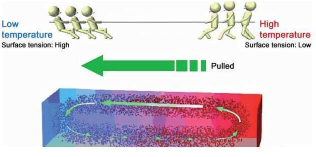 在兩種液體相互接觸的時候,表面張力強(qiáng)的液體會將表面張力弱的液體拉過來,這股力會將表面張力弱的液體反向倒吸進(jìn)表面張力強(qiáng)的液體之中,科學(xué)家將這一現(xiàn)象命名為馬拉高尼效應(yīng)。導(dǎo)致這一現(xiàn)象發(fā)生的條件有很多,比如液體的濃度含量,溫度的高低都會讓兩種液體產(chǎn)生馬拉高尼效應(yīng)。