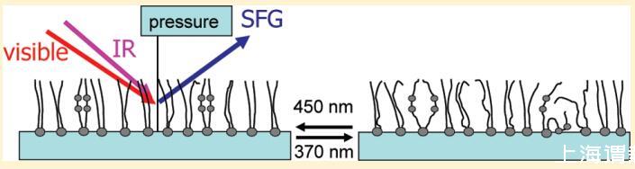 在此,我們研究了光開(kāi)關(guān)脂質(zhì)DT Azo-5P(圖1)的單分子膜,該單分子膜是純的,并與脂質(zhì)1,2-二棕櫚酰-sn-甘油-3-磷酸膽堿(DPPC)混合。如圖1中的紫外/可見(jiàn)光譜所示,光活性脂質(zhì)可分別在370 nm和450 nm的光照下從其反式狀態(tài)切換到順式狀態(tài)并返回。我們將表面壓力測(cè)量與無(wú)標(biāo)簽、寬帶振動(dòng)和頻產(chǎn)生(VSFG)光譜相結(jié)合。這些技術(shù)使我們能夠研究空氣-水界面上的脂質(zhì)分子單層。可以獲得有關(guān)脂類(lèi)與水分子相互作用的信息以及脂類(lèi)的分子結(jié)構(gòu)。在非線(xiàn)性光學(xué)技術(shù)VSFG中,紅外(IR)光束和可見(jiàn)光(VIS)光束在界面處組合,產(chǎn)生具有兩個(gè)入射光束和頻率的信號(hào)。如果紅外與分子振動(dòng)共振,信號(hào)就會(huì)強(qiáng)烈增強(qiáng)。研究表明,這種通過(guò)分子振動(dòng)的技術(shù)可以提供有關(guān)脂類(lèi)分子構(gòu)象和取向的信息。11-18和頻產(chǎn)生在中心對(duì)稱(chēng)介質(zhì)中是被禁止的,因?yàn)樗且粋€(gè)二階非線(xiàn)性光學(xué)過(guò)程。19因此,該技術(shù)對(duì)中心對(duì)稱(chēng)材料(例如水表面)的最外表面分子層敏感。相反,缺少信號(hào)表明界面上的材料或分子基團(tuán)是中心對(duì)稱(chēng)的。對(duì)于金表面偶氮苯功能化的自組裝單分子膜,SFG在確定光異構(gòu)化的截面和機(jī)理方面非常有用。得出的結(jié)論是,光異構(gòu)化是由直接電子激發(fā)驅(qū)動(dòng)的,類(lèi)似于液相中的偶氮苯。3我們將表明,通過(guò)切換光脂,可以可逆地控制脂質(zhì)的表面壓力和分子順序。在同時(shí)含有光脂和脂質(zhì)DPPC的混合單分子膜中,我們可以通過(guò)光學(xué)切換偶氮苯基脂質(zhì)來(lái)控制DPPC的順序。這為體外控制脂質(zhì)-脂質(zhì)相互作用提供了一種新的手段。