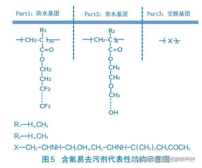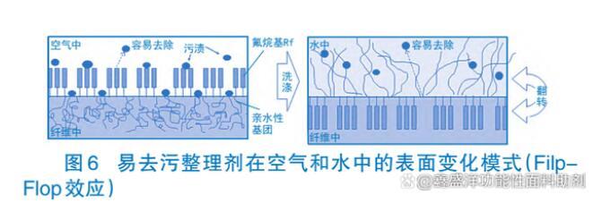 圖5為含氟易去污劑的主要結(jié)構(gòu)含氟易去污整理劑分子中既含有防水防油基團(tuán)——全氟烷基丙烯酸酯聚合物,又含有親水基團(tuán)——聚氧乙烯鏈等??椢锝?jīng)整理后全氟烷基鏈段定向排列在纖維表面,排斥水性和油性污物,使其不易沾污。如果織物被污物沾附,在水洗液洗滌時(shí),親水性鏈段定向排列在纖維與液體的界面上,吸引水分子,提高其易去污性能(也叫Filp-Flop,反轉(zhuǎn)凈洗效應(yīng))。織物水洗后烘干,親水鏈段脫水,氟烷鏈段重回其主導(dǎo)地位,再度呈現(xiàn)良好的防水防油性能。