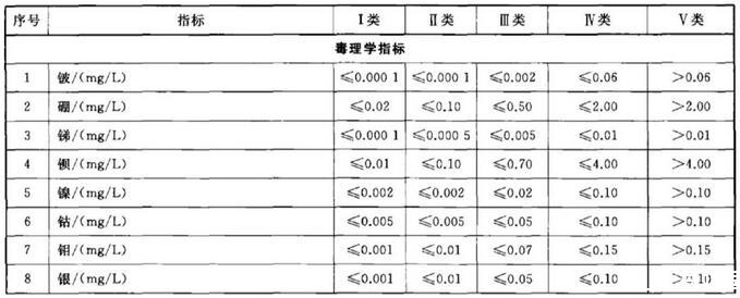 依據(jù)我國(guó)地下水質(zhì)量狀況和人體健康風(fēng)險(xiǎn),參照生活飲用水、工業(yè)、農(nóng)業(yè)等用水質(zhì)量要求,依據(jù)各組分含量高低(pH除外),分為五類。
