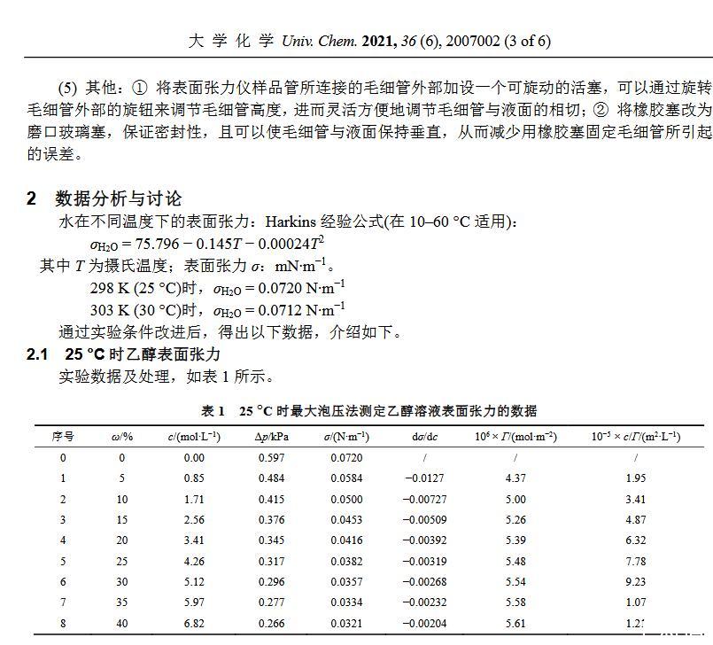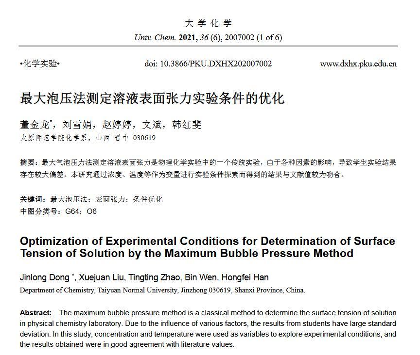 【摘要】:最大氣泡壓力法測定溶液表面張力是物理化學實驗中的一個傳統實驗,由于各種因素的影響,導致學生實驗結果存在較大偏差。本研究通過濃度、溫度等作為變量進行實驗條件探索而得到的結果與文獻值較為吻合。