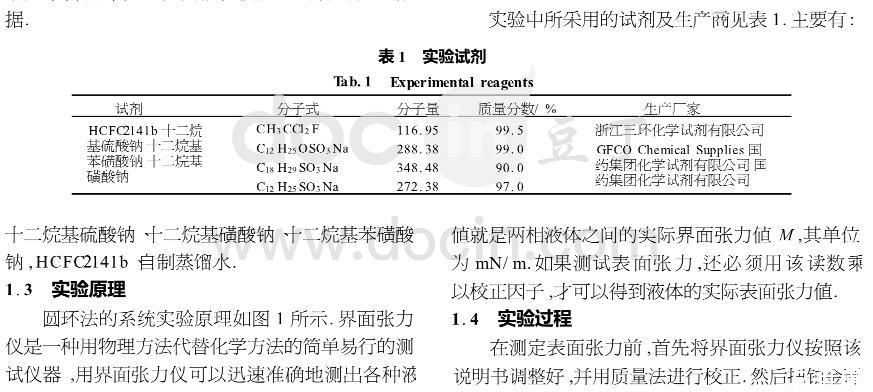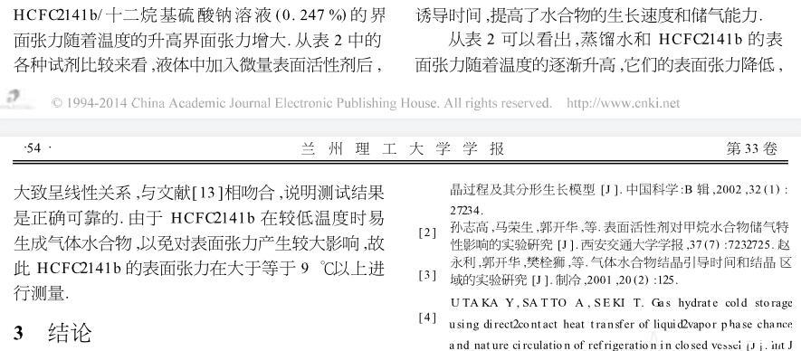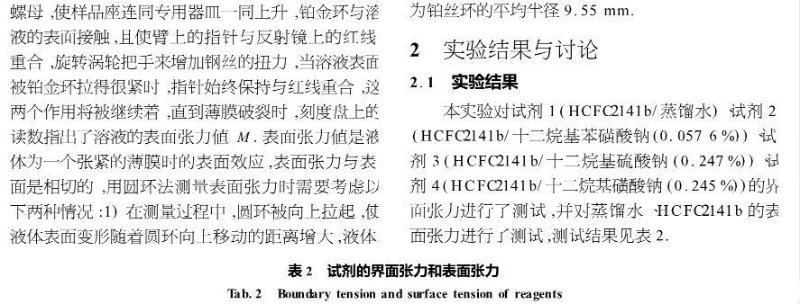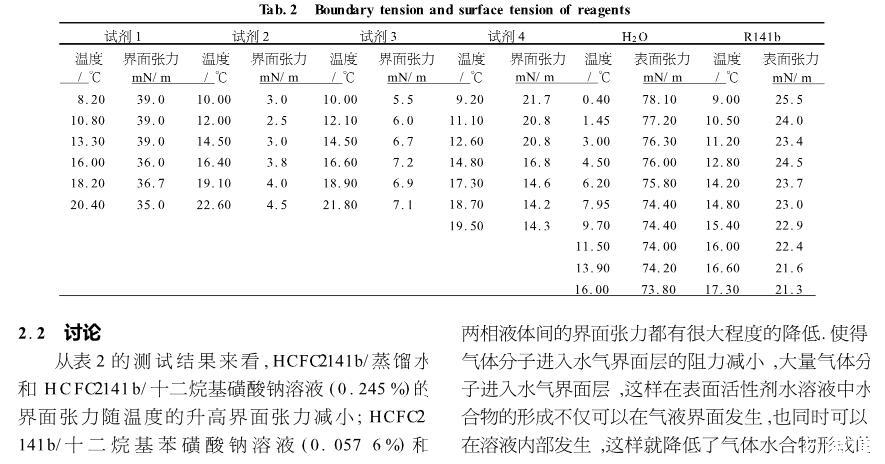 【摘要】:表面活性劑能夠減小液體的表面張力以及兩相液體間的界面張力,界面張力的減小有利于促進氣體水合物快速形成和提高水合物儲氣能力.為定量研究兩相液體間界面張力對氣體水合物形成的影響,用界面張力儀實測不同溫度時蒸餾水、HCFC-141b的表面張力以及HCFC-141b/蒸餾水、HCFC-141b/十二烷基硫酸鈉溶液(0.247%)、HCFC-141b/十二烷基磺酸鈉溶液(0.245%)、HCFC-141b/十二烷基苯磺酸鈉溶液(0.057 6%)的界面張力,測試結果表明,表面活性劑對降低兩相液體間界面張力的作用十分明顯,其中十二烷基苯磺酸鈉溶液對降低界面張力最為突出,降到HCFC-141b/蒸餾水界面張力值的9%左右,為定量研究氣體水合物等優選表面活性劑提供了科學的依據。
