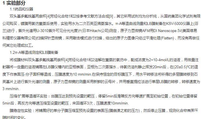 Langmuir-Blodgett膜技術(shù)(LB膜)是一種精確控制薄膜厚度和分子排列的單分子膜沉積技術(shù),即在水氣界面上能將成膜材料分子加以緊密有序地排列,形成單分子層,然后再轉(zhuǎn)移到固體襯底上的制膜技術(shù),利用該技術(shù)可以將功能化合物的光學、電磁學、分子識別與催化等性質(zhì)轉(zhuǎn)移到膜材料中。杯芳烴是繼環(huán)糊精、冠醚之后出現(xiàn)的第三代超分子主體分子,它具有空腔可調(diào)節(jié),構(gòu)象可變換,并易于化學改性和修飾等特點,特別是對它進行適當修飾以后的化合物在材料化學,配位化學,生物化學等領域表現(xiàn)出潛在的應用前景與研究價值。基于上述認識最近我們合成了雙頭基多氟烷基兩親杯芳烴化合物1和2(圖1),并對該化合物在空氣/水相界面的成膜性能以及LB膜的結(jié)構(gòu)進行了研究。
